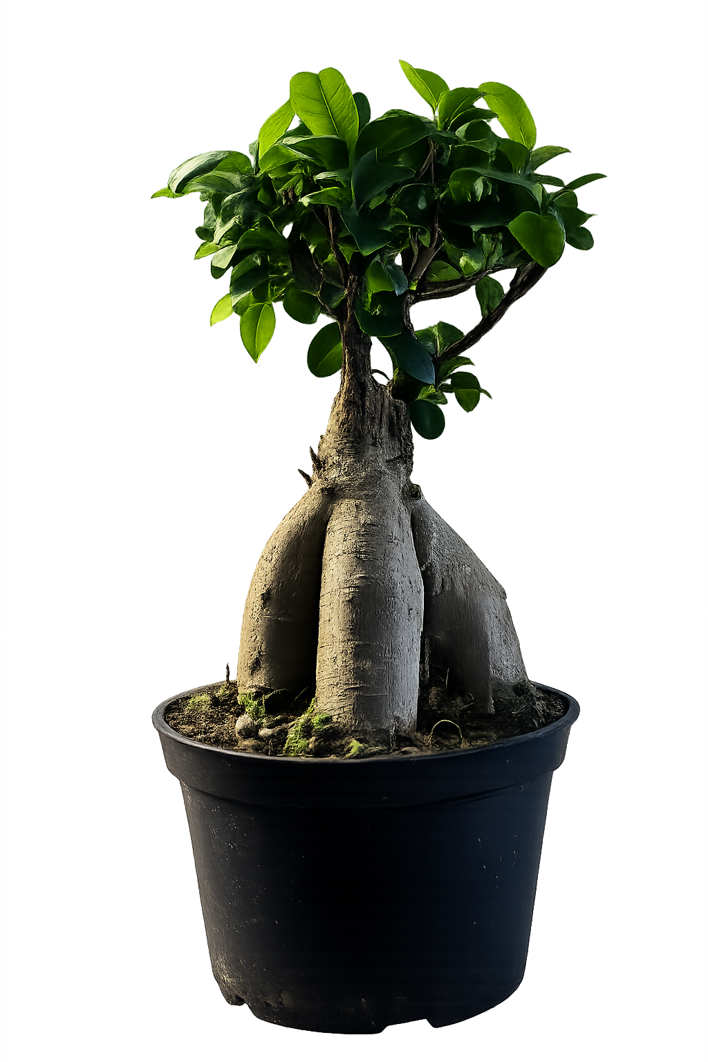 Thick exposed roots, woody trunk — easy beginner bonsai or low-maintenance indoor tree.